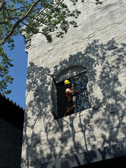 工人們正如同一支默契的交響樂團,精心地安裝著花窗,陽光透過樹枝的縫隙,投下斑駁的影子,倒映在上面。他們以一顆辛勤的心,塑造著每一處風景。